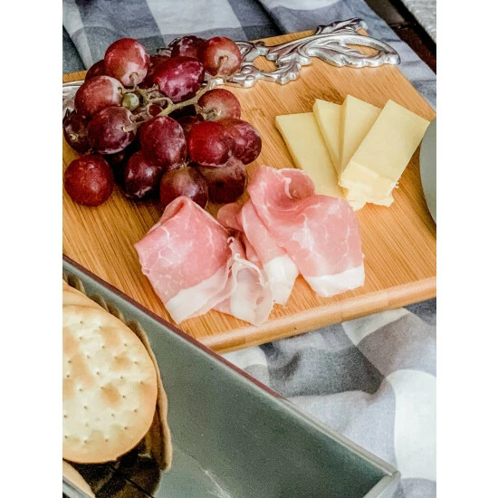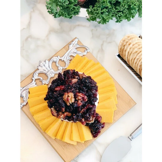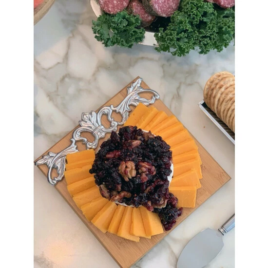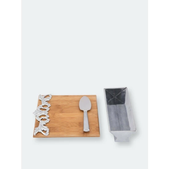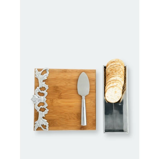 Incorporate handcrafted aluminum and elegant bamboo into your serveware with Arthur Court’s Acanthus Cheese Set.Flourishing acanthus leaves connect on either side of a fleur-de-lis symbol to create an openwork design along the left side of this piece. Despite its intricate texture, this motif, along with the cheese knife and cracker stand, reflect brilliantly against the wood’s soft color.