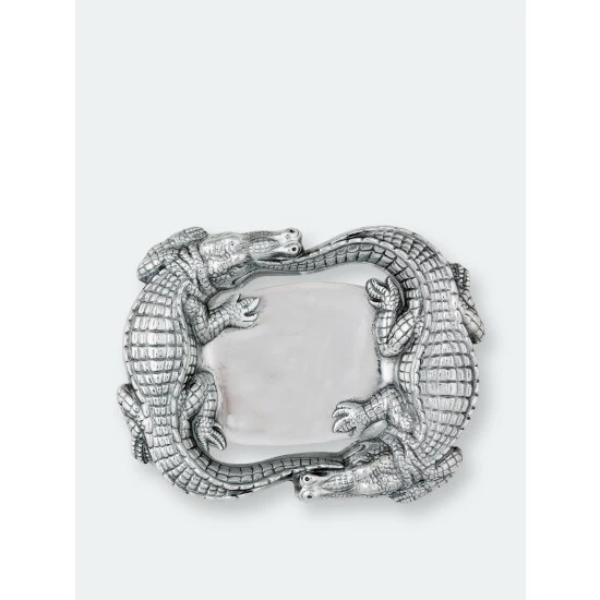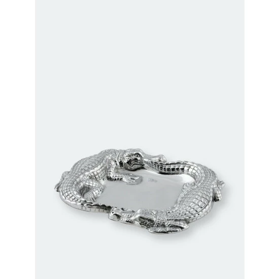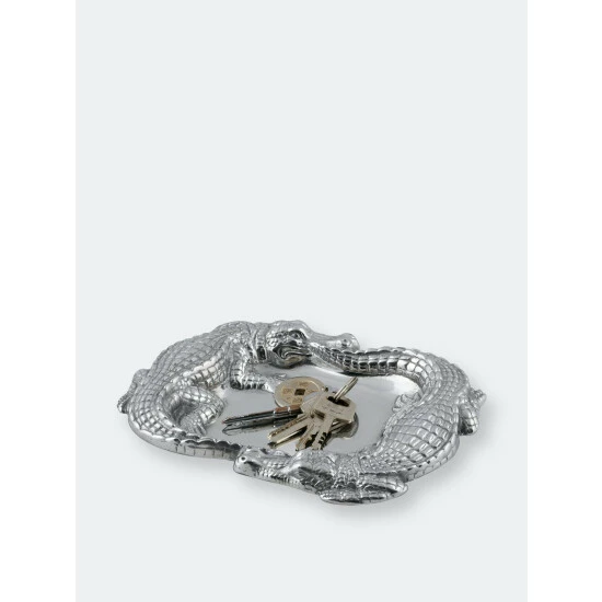 Keep your keys and wallet handy in the stunning display of Arthur Court’s Alligator Catchall.Large alligators seemingly chase each other around the edge of this piece, creating a unique border in the process. Handcrafted in Arthur Court’s signature aluminum, these statuettes feature remarkable detail in their scaly bodies and realistic snouts.