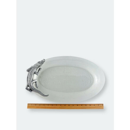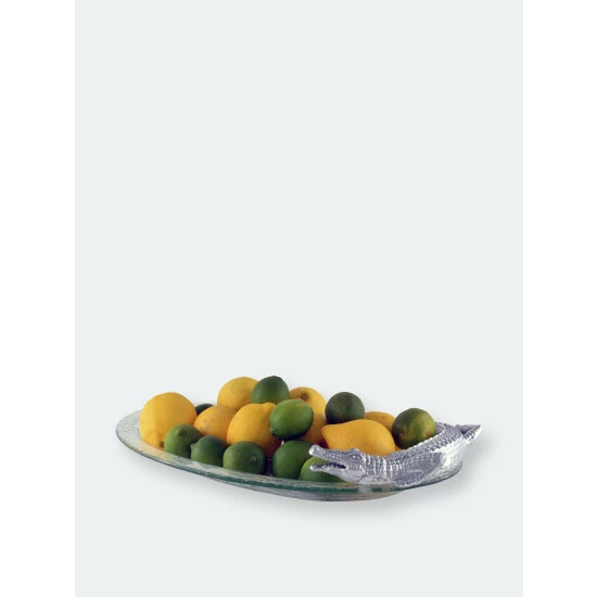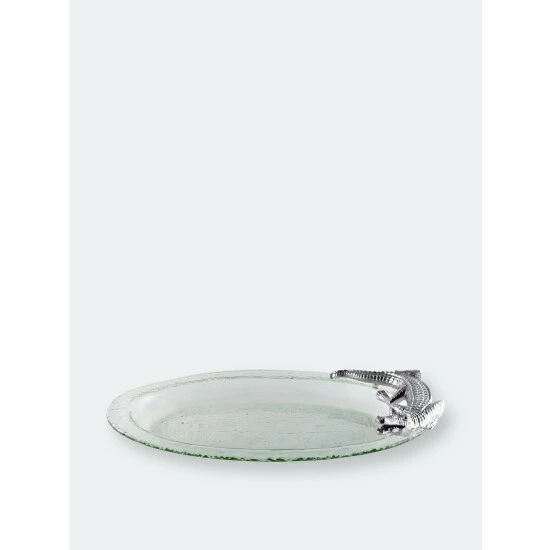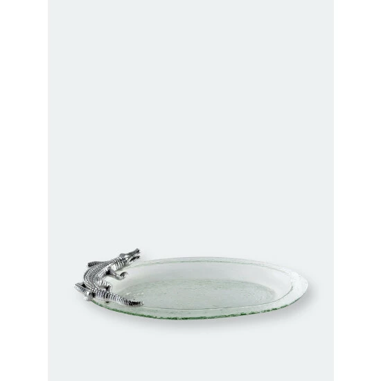 Serve appetizers in elegant style with this Arthur Court alligator glass platter. This round platter is adorned with a handmade alligator that’s crafted from sturdy sand-cast aluminum. The alligator has realistic detailing, including textured skin that looks like scales, and it appears to be guarding the left side of the platter from sneaky hands. The lustrous buffed aluminum of the alligator body reflects against the glass of the tray for eye-catching elegance. It’s easy to clean this platter; simply wash it with mild dish detergent by hand and dry with a soft cloth. This Arthur Court alligator glass platter comes in a charming box, so it’s ready to be given as a gift. It makes a great present for birthdays and housewarming partiesA handmade, aluminum alligator patrols the left edge of this platter as it surveys who is brave enough to take its food. The reptile’s rough, patterned skin reflects a brilliant luster against the clear glass.