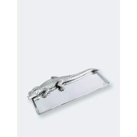 Offer great flexibility to your entertaining needs with this attractive 9×20 Alligator Tray from Arthur Court.A detailed alligator heads the piece, stretching its long body and tail the length of the dish. The scaly texture of its skin mixes well with the smooth, gleaming finish on the rest of the handmade, aluminum tray.