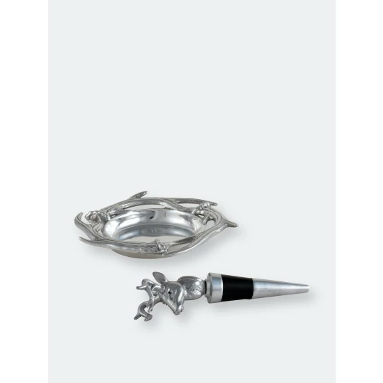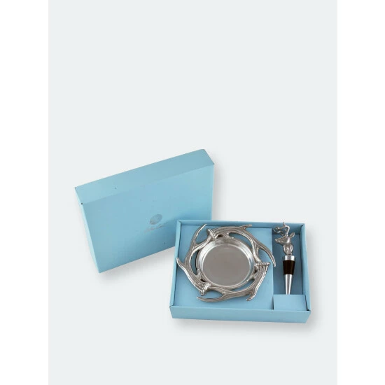 Toast your successful day outdoors with the help of this handsome antler wine coaster and stopper set from Arthur Court. The 7-inch coaster fascinates as it pairs the antler theme with a sense of movement and energy, and the 6-inch wine stopper places a proud elk atop your current bottle of wine. Present this wine set to your favorite outdoorsman as a housewarming present in the included gift box, or give it the place of pride in your mountain cabin as you enjoy relaxing evenings with family and friends. These graceful implements combine the decorative with the functional, and each piece is handcrafted using a signature sand-cast aluminum alloy that complies with all FDA regulations and doesn’t tarnish with time.The coaster captures the grace of elk in their movement, while the decorative appeal of these animals displays in the stopper. Handcrafted in sand-cast aluminum, this set makes the perfect pair for any outdoorsman.