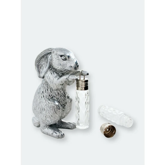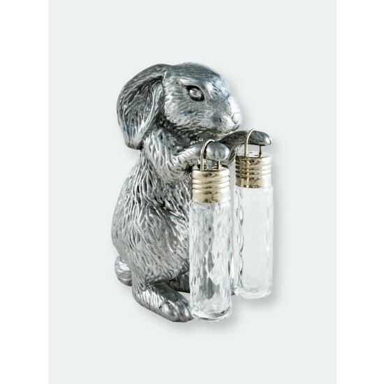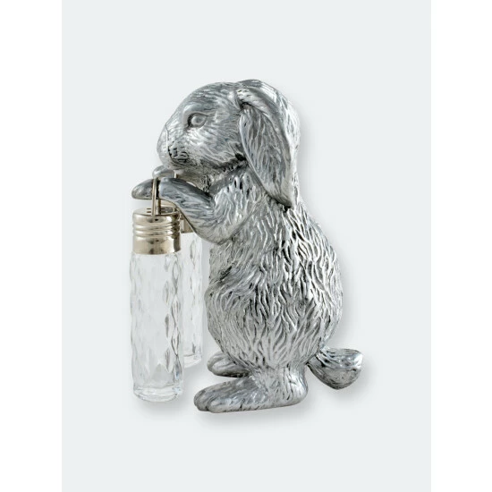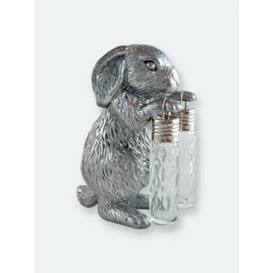 Choose wisely from this rabbit sensei and have a little fun at the table with Arthur Court’s Bunny Hanging Salt and Pepper Set.Masterful lines and fine detail give the rabbit a realistic appeal as he presents the glass dispensers in his outstretched arms. Handcrafted in sand-cast aluminum, the bunny’s powerful aura only adds to this piece’s intrigue.
