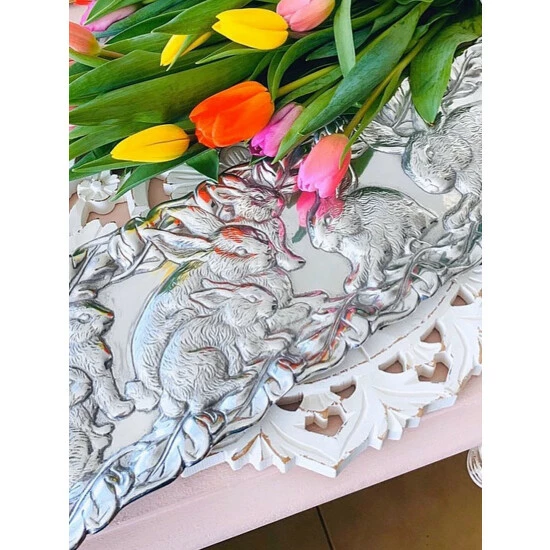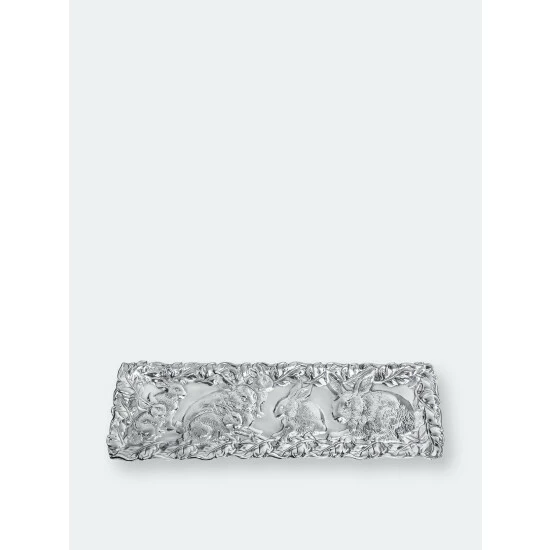 Gather the family around the kindred spirit of Arthur Court’s Bunny Oblong Tray.A group of rabbits band together in the middle of this tray as the dense forest surrounds them. Arthur Courts craftsmen capture incredible detail within the bunnies’ fur and the framing foliage in this handmade, aluminum design.