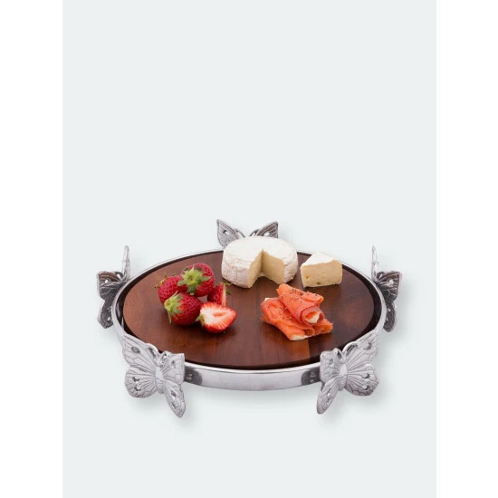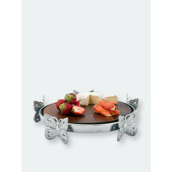 Draw attention to the snacks by putting them on Arthur Court’s Butterfly Wood Cheese Pedestal.Using their hindwings as legs, five butterflies elevate this piece as they circle around the handmade, aluminum stand. Symbolic of a monarch, these insects feature holes among the intricate patterns within their wings. The removable, wooden insert accentuates the brilliant luster of these designs.