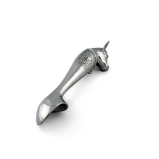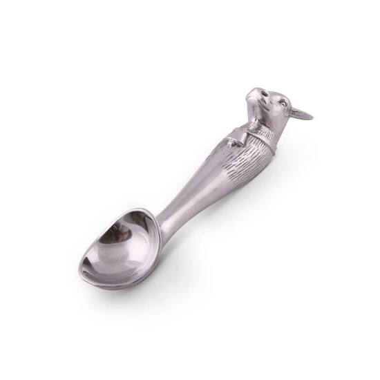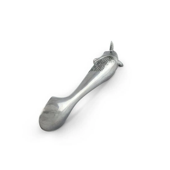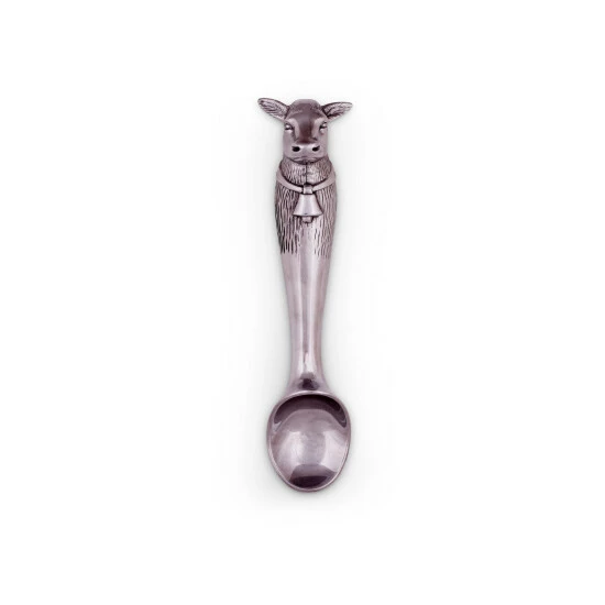 Watch the adorable farm animal in Arthur Court’s Cow Ice Cream Scoop steal the show at your next party. A cow head adorns the end of this piece as its big ears and muzzle jut out in realistic fashion. A distinguished bell hangs off a large band that stretches across the animal’s torso, which is covered in intricate lines.The smooth bowl and neck of this handmade, aluminum scoop gleams against the textured designs on the handle. Size: L: 10.0″ Care: Wash by hand with mild dish soap and dry immediately – do not put in dishwasher.