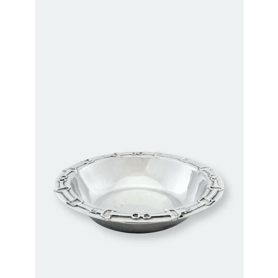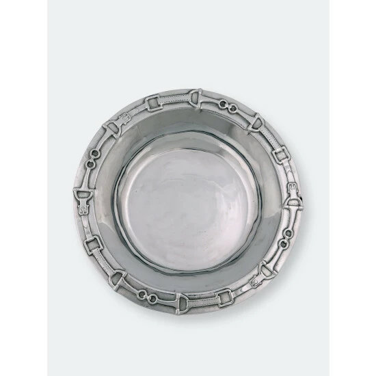 Attract your horse-loving friends with this crafty 12″ Equestrian Bowl from Arthur Court. Bits connect around the edge of this piece as leathery straps wrap around the rein rings and fasten into a buckle. The circular pattern draws your eyes into the middle of this handmade, aluminum bowl.