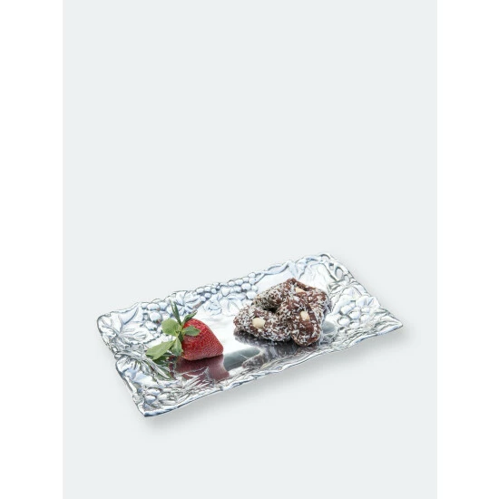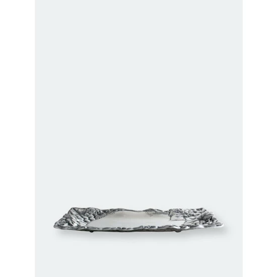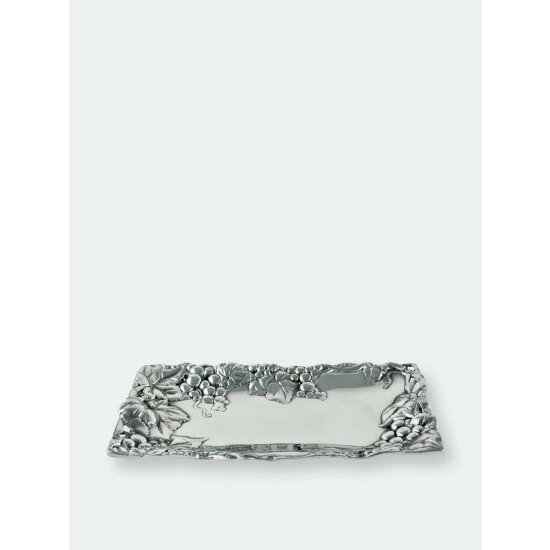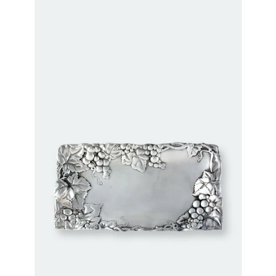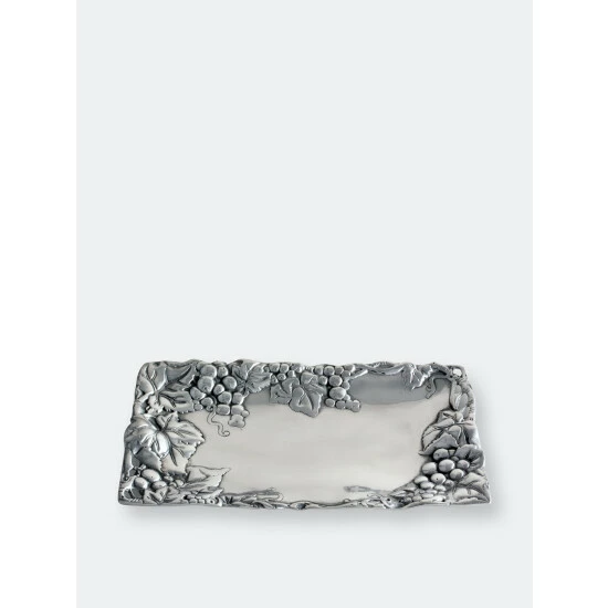 Style your serve ware with the exquisite detail of this best-selling 6×12 Grape Bread Tray from Arthur Court.Grapes hang from the edges and act as a picture frame for the lustrous interior of this piece. Intricate vines and leaves add layers of texture to the design as they mingle with the fruit on this handmade, aluminum tray.