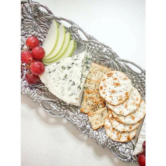 A dense collection of vines and leaves create the dish’s open work border, while bundles of grapes hang off of it into the middle. The striking details of the fruit and foliage gives this handmade, aluminum tray remarkable definition.