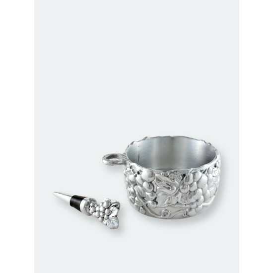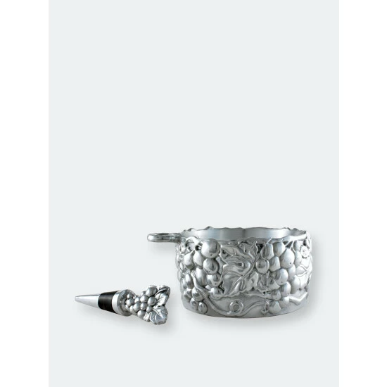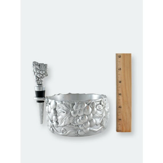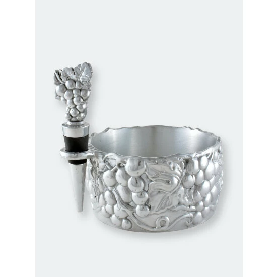 Punctuate your wine night by using Arthur Court’s Grape Wine Caddy and Stopper Set.Heavy lines highlight the definition within the caddy’s grape and leaf motif, while a vine swings off its side to form a hanging place for the stopper. A bundle of grapes stands vertically atop the stopper to add even more appealing detail to this handmade, aluminum set.