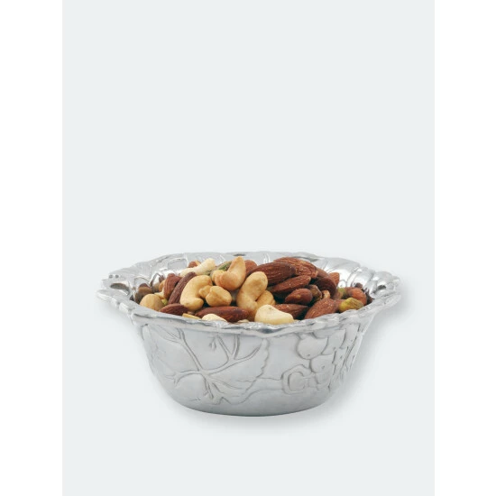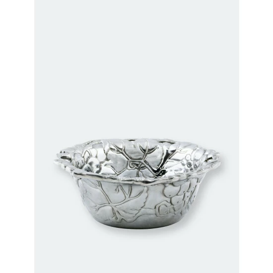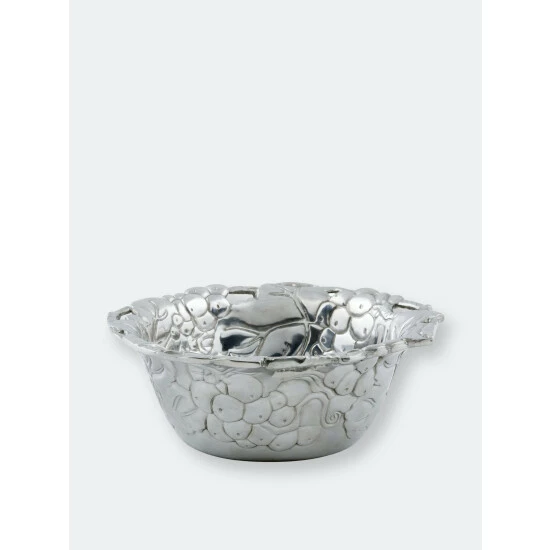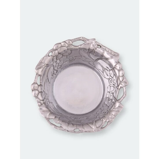 Encase your favorite finger foods in the fruity shell of Arthur Court’s Grapevine Nut Bowl. Large bundles of grapes and leaves cover the surface of this piece as vines create fingerholds in its flared edge. The heavy lines and dense patterns in this design give the handmade, aluminum bowl a unique texture. Size: Diameter: 6.0″ / H: 2.5″ Care: Wash by hand with mild dish soap and dry immediately – do not put in dishwasher.