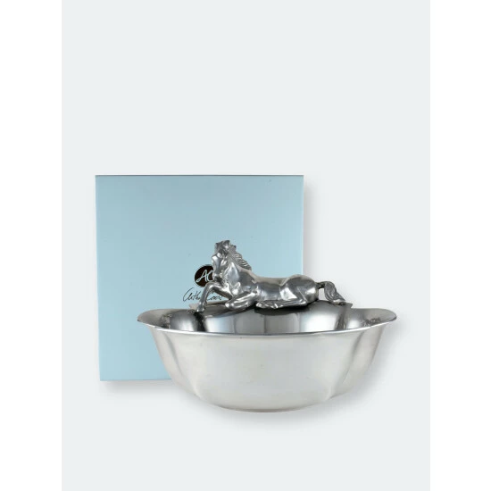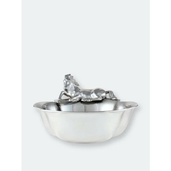 A beautifully detailed stallion sits along one edge of this piece as it waits patiently for the food to arrive. The horse’s friendly demeanor gives life to the design, while the slightly flared sides of this handmade, aluminum bowl make it easily transportable.