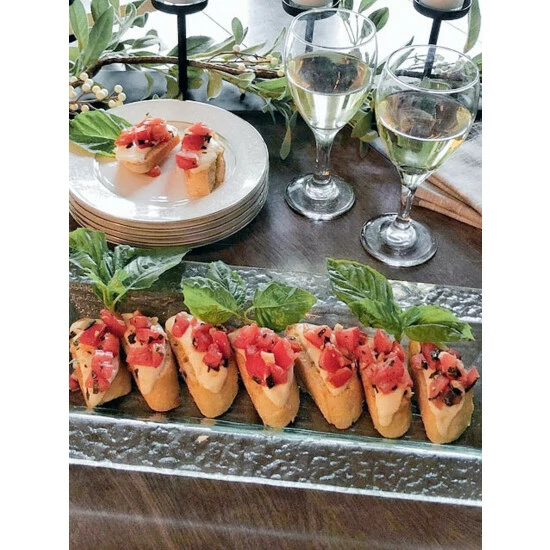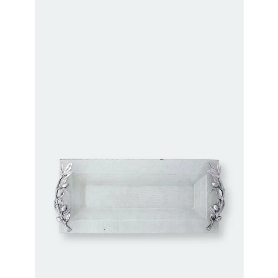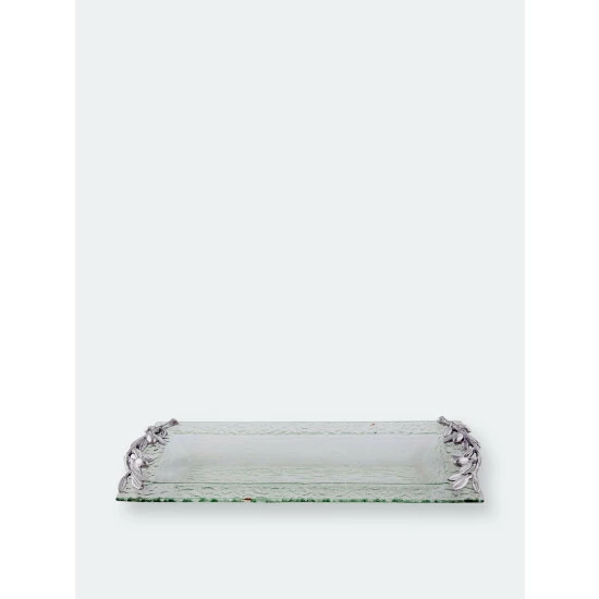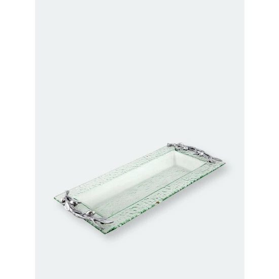 Inspired by the beauty of Tuscany, this uniquely designed glass oblong tray with artfully handcrafted olive branch handles, creates a beautiful mediterranean atmosphere on every table.