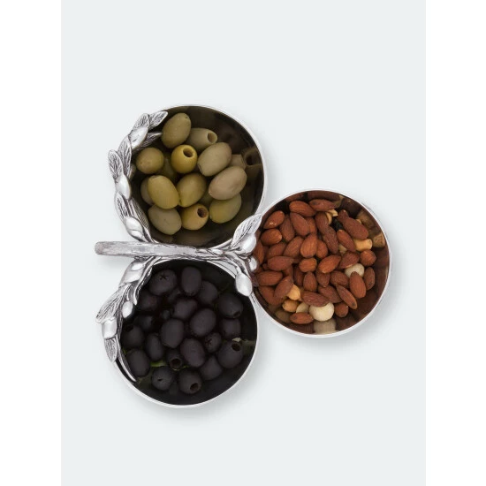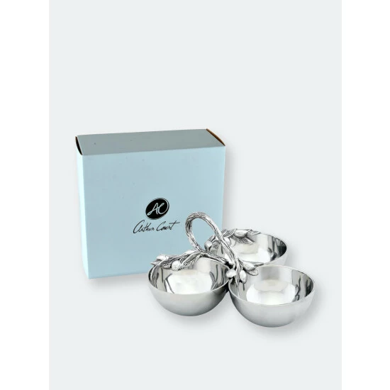 Three highly polished metal, Arthur Court Signature Sand-Cast Aluminum bowls join together, attached to a rustic looking olive branch, heavy with ripe fruit. Fill with an assortment of olives, nuts and candies or spreads and tapenades, place on a table and feel the warmth of Tuscany enter the room.Create a sun soaked Mediterranean feeling anywhere you serve from Arthur Court’s 3 Bowl Olive Condiment Server.