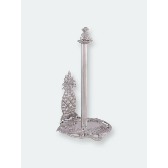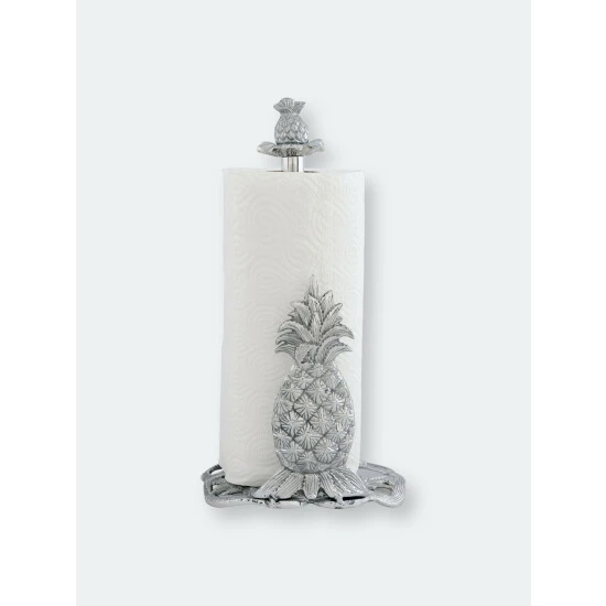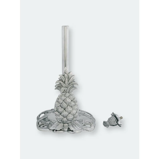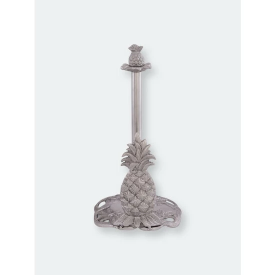 Create a tropical atmosphere in your kitchen with this Pineapple Paper Towel Holder from Arthur Court. Detailed leaves erupt from the crown of a large pineapple at the base of this piece, while suckers fan out underneath the fruit.A smaller pineapple sits atop the handmade, aluminum design, with both pieces showing incredible definition in their spiky, square-patterned shells.
