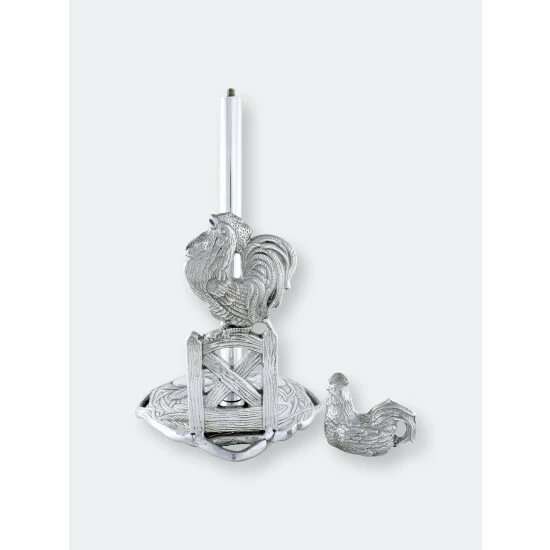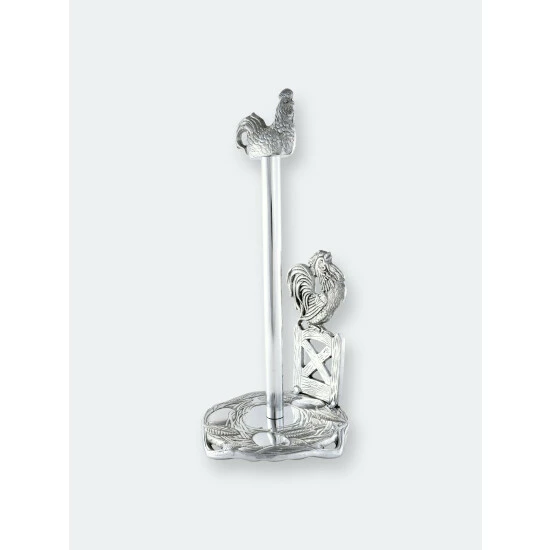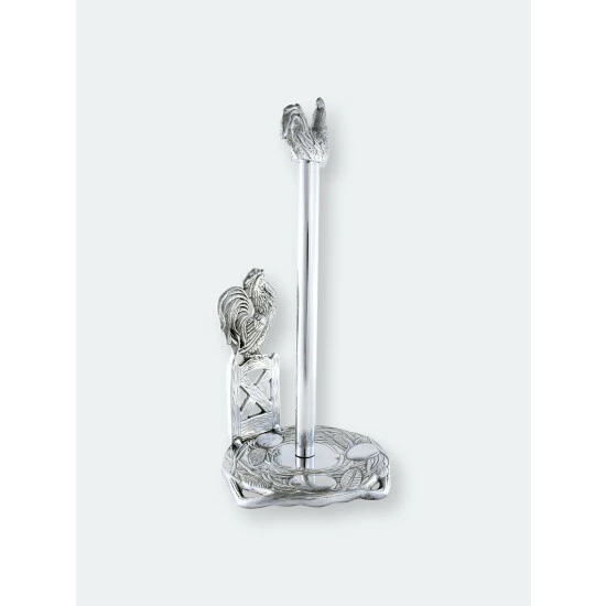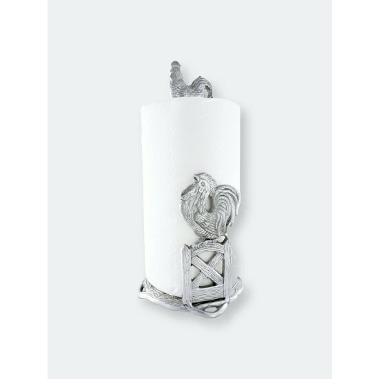 Create a lively atmosphere in your kitchen, but without all the noise using Arthur Court’s Rooster Paper Towel Holder.A beautiful rooster postures its body skyward to deliver a wake-up call as it stands atop a fence featuring two, diagonal crossbeams. Perched above the paper towels, a peaceful hen points its body east, towards the rising sun. Both of the handmade, aluminum birds exhibit remarkable definition in their intricate feathers and swishing tails.