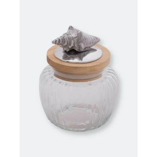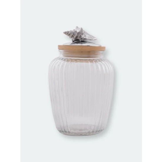Uniquely shaped, stripe pattern glass canister with a natural, elegant and environmentally sustainable Acacia wood lid. Detailed metal art in aluminum, a whelk-type seashell knob tops the jar. Premium silicone sealing ring creates an airtight environment. perfect for keeping dry goods fresh.