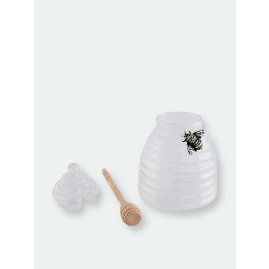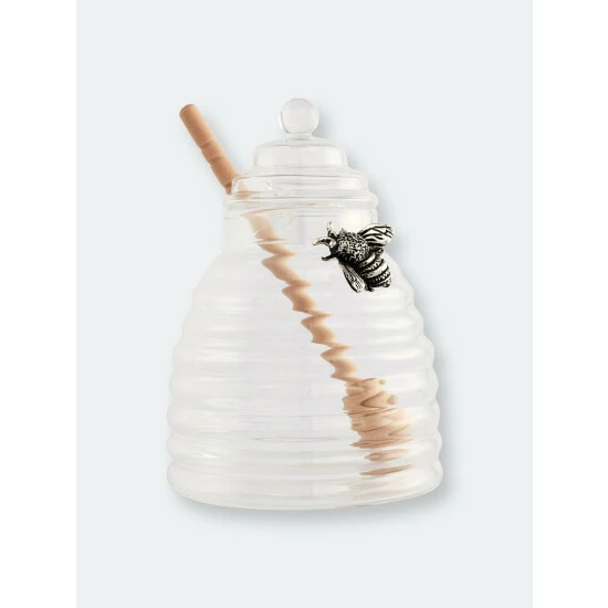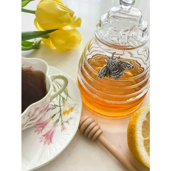 Our unique honey pot with dipper designed by our artists at Arthur Court will be your new favorite way to enjoy honey. The beautiful honey pot shape is inspired by the natural beehive and features a hand-crafted bee sculpture that adds a charming accent.The honey dripper is made of wood, holds just the right amount of honey, and is designed to perfectly fit at the side of the jar. The decorative honey container will keep your nectar fresh and ready for every enjoyable moment.