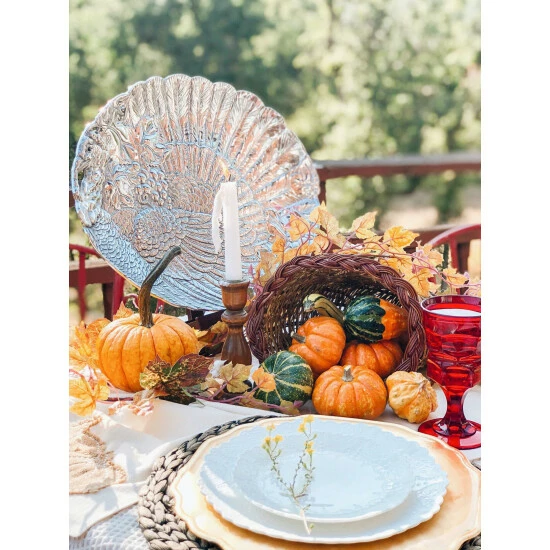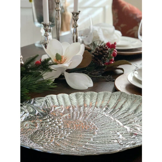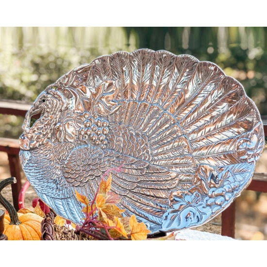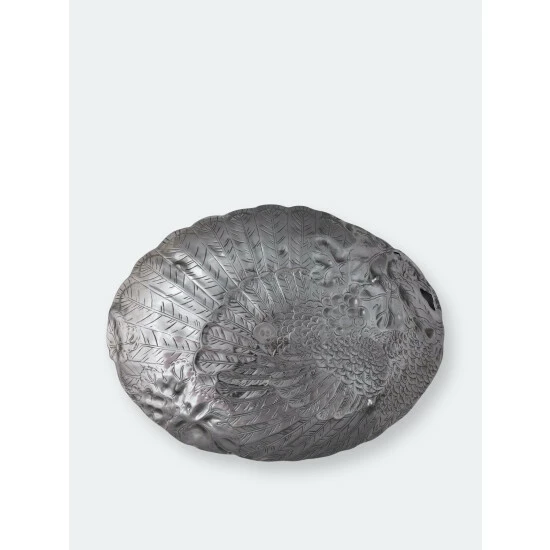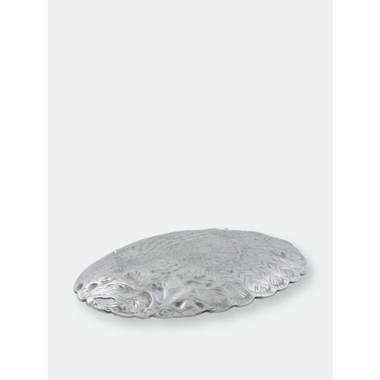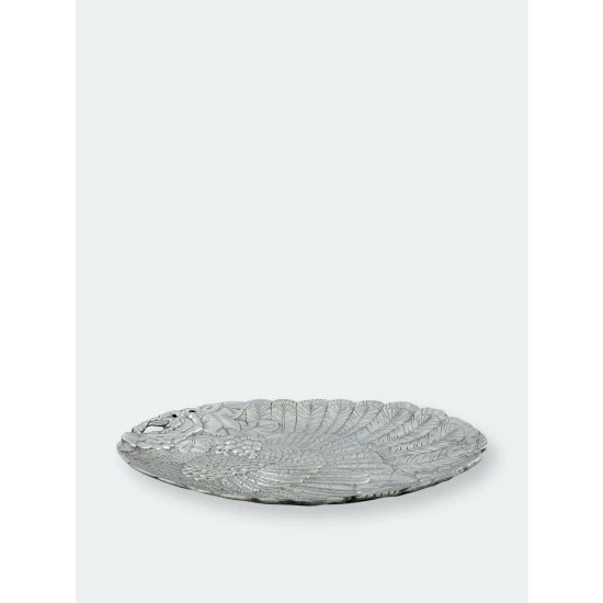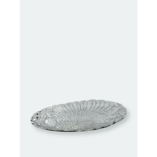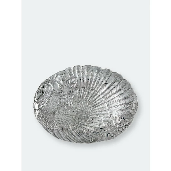 Flatten out your meat display with this Turkey Oval Platter from Arthur Court. A turkey balloons into a circular dish as its small head pushes up against one of the side edges.Exceptionally defined grapes and greenery adorn both sides of this handmade, aluminum tray, while intricate feathers fan out around them in beautiful arrangements of detail.